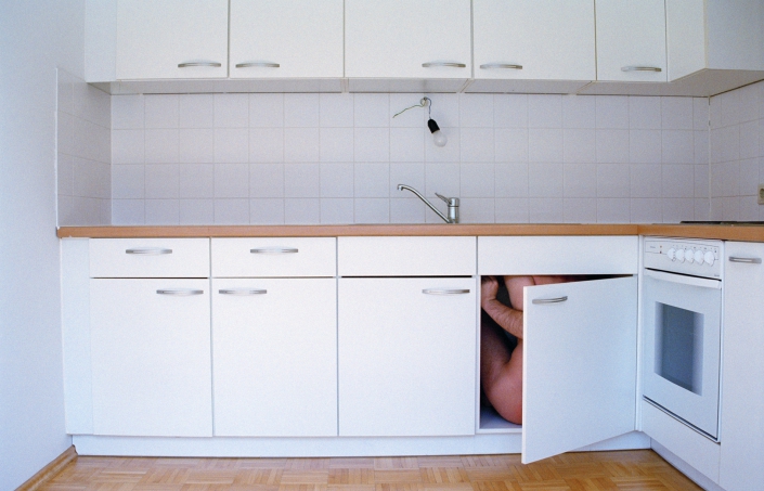 Für die Foto-Serie „In der Maschine“ hat sich Marko Zink unerlaubt Zutritt in leerstehende Mietobjekte verschafft und sich in den Haushaltsgeräten und im Mobiliar der Wohnung versteckt. Diese heimliche Aktion findet ihre Übersetzung in den weiß und steril wirkenden Fotografien wieder. Die abgebildeten Maschinen und Einrichtungen spucken Körperteile des Künstlers aus. Oft schaut es aber auch so aus, als ob sie den Künstler verschluckten und die jeweilige, verharrende Gliedmaße im Kontrast mit der jeweiligen Maschine stünde.